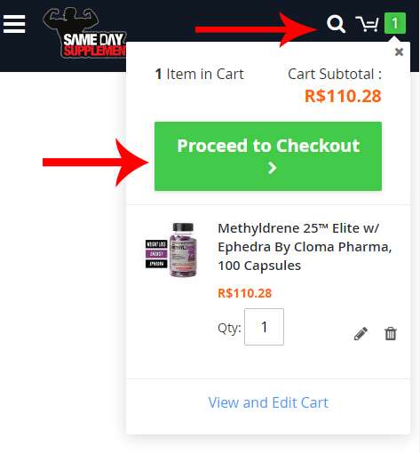 Simulando que iremos comprar apenas o Methyldrene, agora precisamos adicionar o produto no carrinho, clicando em “add to cart”, em seguida, para fechar o pedido, é preciso clicar no ícone do carrinho, que fica no topo direito do site e em seguida clicar em “Proceed to Checkout”.