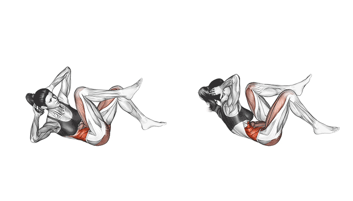 Durante a execução, o movimento de rotação do tronco e o toque alternado entre cotovelo e joelho recrutam bastante os oblíquos internos e externos (1,2), responsáveis pela rotação e flexão lateral da coluna.